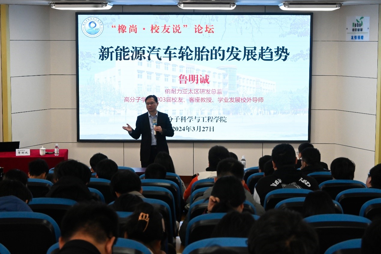 3月27日上午,高分子学院首届“橡尚•校友说”论坛在学院阿朗新科报告厅举行,学院2003届校友、客座教授、学业发展校外导师,倍耐力亚太区研发总监鲁明诚担任主讲嘉宾。学院党委书记宣宗伟、党委副书记兼副院长贾明明参加活动。