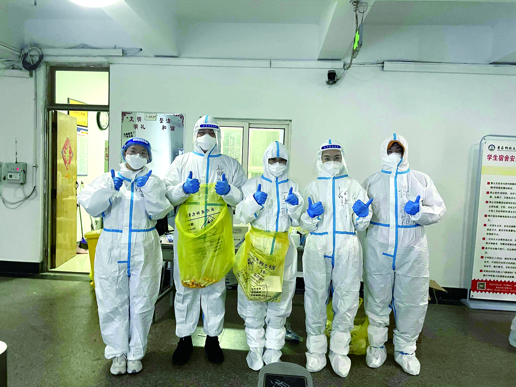 静默管理期间,核酸检测和送餐上门是学校、学院的两件头等大事。让学生们吃上热乎的饭、喝上热乎的汤,成为老师们一致的追求目标。一栋宿舍楼有900多名学生,900多份盒饭怎样以最快的速度送到同学们手中?为提高送餐效率,学院依托学生处组建了“楼长+层长+舍长”网格化队伍,组建了送餐志愿者团队。送餐是一项体力活,学生宿舍分布在不同楼层,没有电梯,几趟下来全身是汗。每次送餐结束,看着同学们都吃上热乎的饭菜,老师们紧绷的神经这才舒缓下来。“说不累是假的,但穿上防护服,就必须义无反顾。”王聪老师笑笑说。
