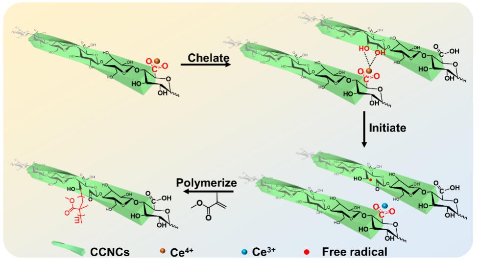 纳米纤维素表面存在可反应的羟基,可通过化学改性的方法改善CNCs的表面极性和热稳定性,赋予纳米纤维素不同的性质。硝酸铈铵(CAN)在水介质中引发接枝聚合是一种具有高度选择性的CNC接枝聚合物改性引发剂。然而,为了抑制CAN的水解,引发反应通常在强酸性条件下进行,强酸会造成严重的环境问题,限制可聚合的单体种类。为了解决这个问题,张建明团队将起引发作用的铈离子通过络合作用稳定在羧基化CNC(CCNC)表面,与CCNC共同组成“大分子引发剂”,成功实现了无酸条件下甲基丙烯酸甲酯(MMA)在CCNC表面的聚合,打破了CAN只能在强酸条件下引发接枝的限制,并拓宽了可接枝的聚合物种类。