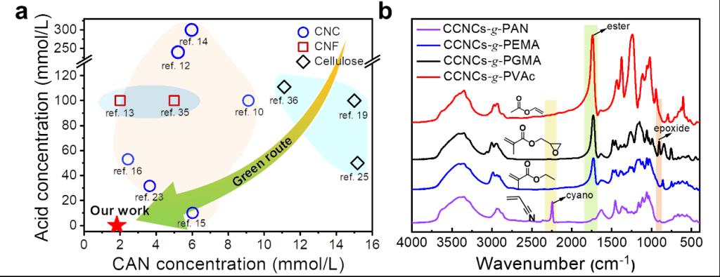 图4. (a)由CAN引发的纳米纤维素接枝聚合物改性的酸浓度和引发剂浓度与文献报道的比较;(b) CNCs-g-PAN、CNCs-g-PEMA、CNCs-g-PGMA和CNCs-g-PVAc样品的FTIR光谱。