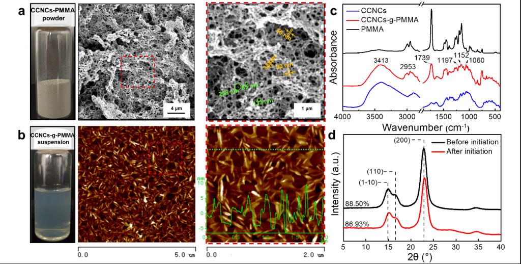 图2.(a) CCNC-PMMA粉体的照片和SEM图像;(b) CCNC-g-PMMA悬浮液的图像和AFM图像;(c) CCNC、PMMA和CCNC-g-PMMA的红外光谱;(d) CAN引发前后CCNC的XRD谱图。