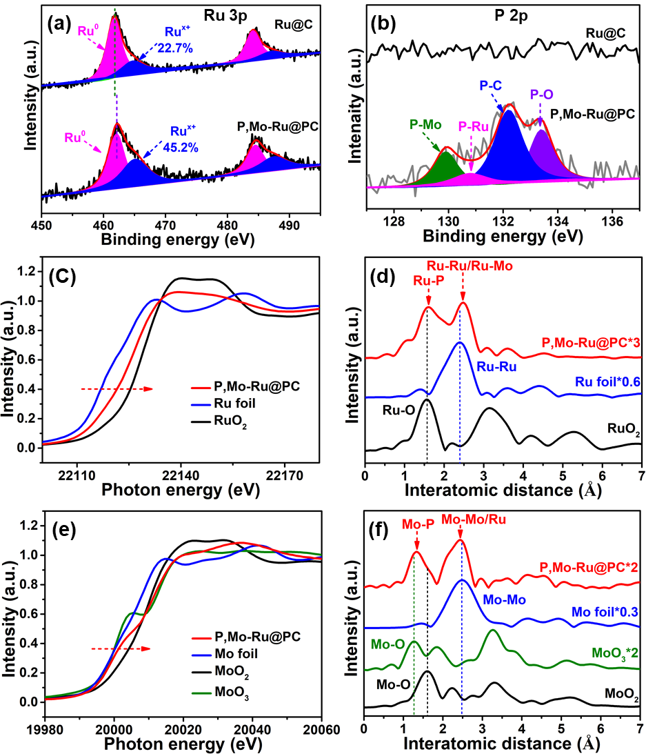 随后采用X射线光电子能谱(XPS)、X射线吸收近边结构(XNAES)和扩展X射线吸收精细结构(EXAFS)表征手段,揭示了P, Mo-Ru@PC中Ru与Mo和P之间会发生电子转移,这使得HO-H的裂解过程更容易进行,从而使催化剂P, Mo-Ru@PC表现出优异的HER活性。