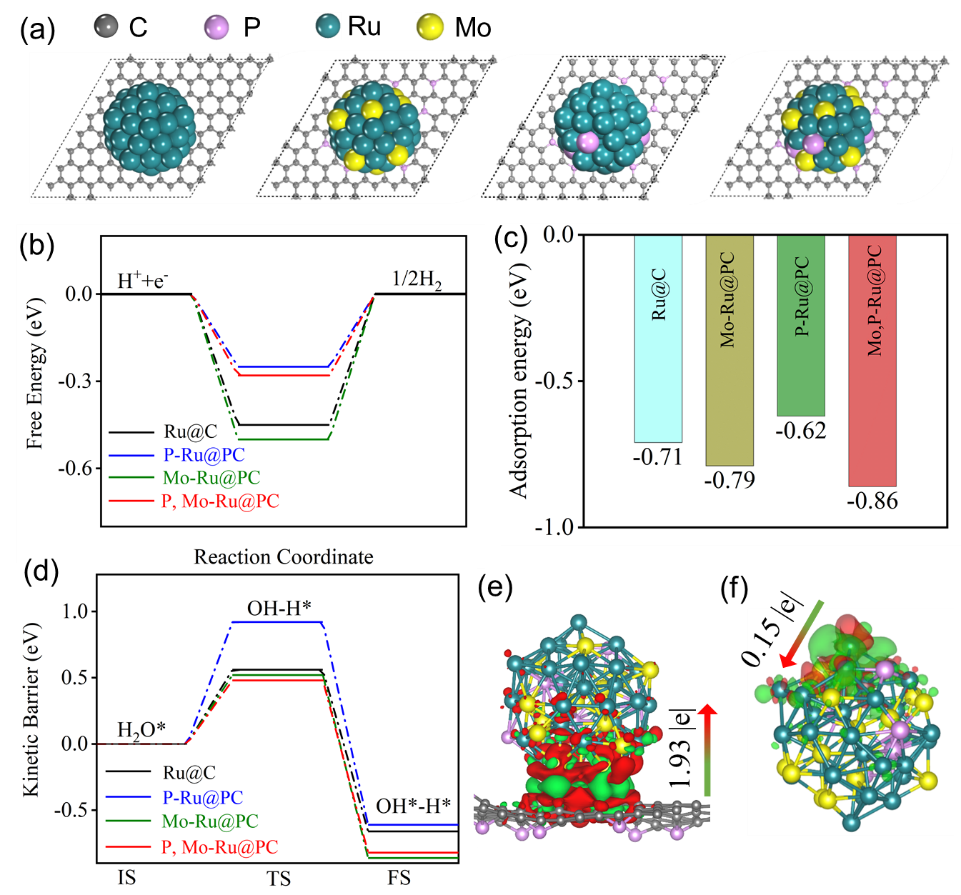 理论计算表明,P和Mo原子的引入促进了电荷再分配,大大降低了H-OH键断裂的能垒,加速了水的离解,从而使该催化剂在碱性介质中的析氢活性大大增强。
