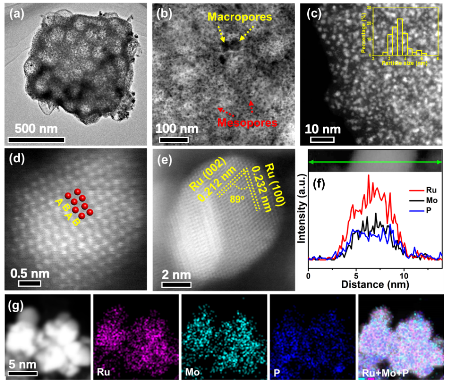 作者首先采用透射电镜(TEM)以及高角度环形暗场扫描透射电镜(HAADF-STEM)表征手段,揭示了P, Mo-Ru@PC为粒径超小的纳米团簇。HAADF-STEM图表明,P, Mo-Ru@PC的原子排列顺序为ABABAB…的六方密堆相(hcp)结构,且图中清晰晶格条纹对应于Ru的(101)和(100)晶面。此外,由于P和Mo的掺杂,使P, Mo-Ru@PC的晶格间距大于纯相hcp Ru。单个纳米颗粒的EDX线扫描和mapping图表明了Mo和P成功掺杂到了Ru的晶体结构中。