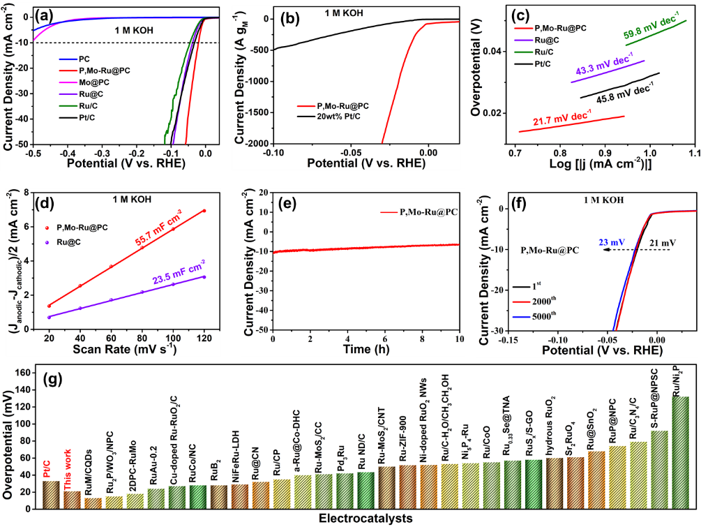 在碱性电解质中,P, Mo-Ru@PC仅需过电位为21 mV,其电流密度就可达到10 mA cm-2。另外,该催化剂中Ru的含量仅为1.8 wt%,在碱性介质中都表现出极高的质量活性。当过电位为25 mV时,其质量活性高达1525 mA mgRu-1,是商业20 wt% Pt/C质量活性(70 mA mgPt-1)的21.8倍。