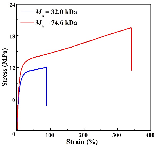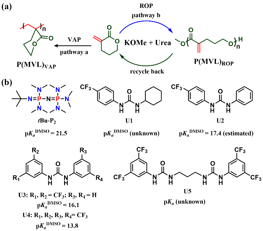 α-亚甲基-δ-戊内酯(MVL)可以由生物质来源的δ-戊内酯(δVL)与甲酸乙酯通过两步反应简单制备。作为一种双官能团环内酯单体,之前的研究集中于MVL的环外双键加成聚合(VAP,pathway a),而通过开环聚合制备可回收聚酯仍然是一个挑战(ROP,pathway b)。在前期工作的基础上,365英国上市官网在线沈勇副教授和李志波教授通过使用强碱与一系列具有不同结构和pKa值的脲构筑二元催化体系,成功实现了MVL的化学选择性开环聚合,聚合呈现“活性”/可控聚合特性,所得聚合物端基、分子量及分子量分布可控。使用有机磷腈碱tBu-P2与二元脲U5为催化剂时,制备得到的聚酯P(MVL)ROP分子量高达74.6 kDa。值得注意的是,高分子量P(MVL)ROP表现为韧性塑料,其力学性能与商品化的等规聚丙烯(PP)和低密度聚乙烯(LDPE)相当。此外,通过硫醇-烯“点击化学”反应可以对P(MVL)ROP侧基的双键进行后修饰,进一步调控聚酯的性质。