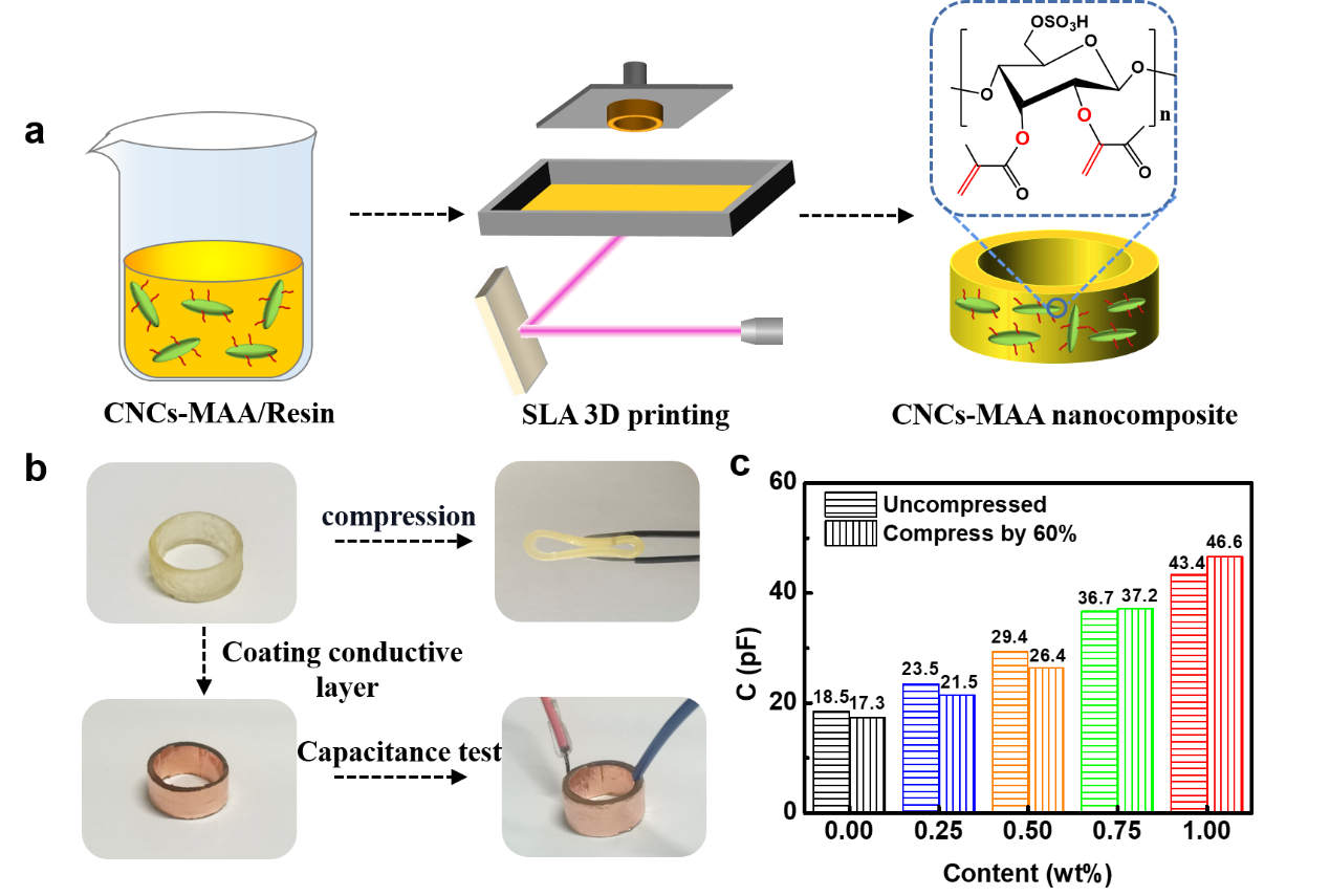 本研究还对CNCs-MAA/MMPR复合材料进行了实际储能应用探索。通过光固化3D打印的方法将CNCs-MAA/MMPR复合树脂制备为环形电容器(图2),对电容器进行电容测试,数据表明,CNCs-MAA的加入提升了电容器的电容,而且电容器在受力变形的情况下,电容仍处于较稳定的状态。