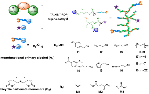近日,高分子科学与工程学院王庆富教授团队开发了一种“A1+B2”开环聚合法,用于可控合成超支化聚碳酸酯。该成果以“Synthesis of Aliphatic Hyperbranched Polycarbonates via Organo-Catalyzed“A1+B2”-Ring-Opening Polymerization”为题发表在高分子科学旗舰期刊《Macromolecules》上。