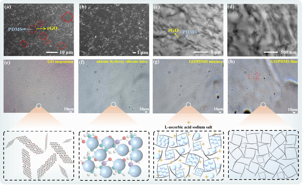 图1. rGO/PDMS薄膜的断面(a-b) SEM图和(c-d) TEM图;(e) GO悬浮液、(f)阴离子羟基硅油乳液、(g) GO/PDMS混合物和(h) GO/PDMS薄膜的光学显微镜照片。