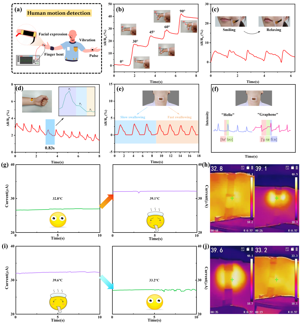 图4. (a)人体运动检测示意图;(b-c)组装在手指关节和脸颊上的传感器的光学图片和相应信号;(d)连续监测的脉搏信号、附在手腕上的传感器的光学图片(左侧插图)和单个脉搏信号(右侧插图);(e-f)传感器固定在喉咙上,监测志愿者吞咽或说“Hello”和“Graphene”时的相对电阻变化;(g)接近热源期间的电流变化;(h)接近热源时人手背的红外热像图;(i)热源撤离后的电流变化;(j)热源撤离后人手背的红外热像图。