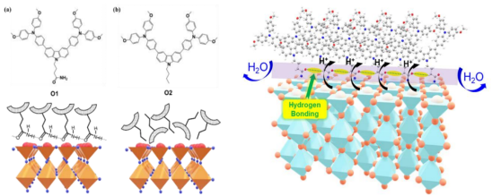 图1。(a)O1和(b)O2在钙钛矿表面的化学结构和各自的假设排列及(c)O1HTMs钝化模拟示意图。