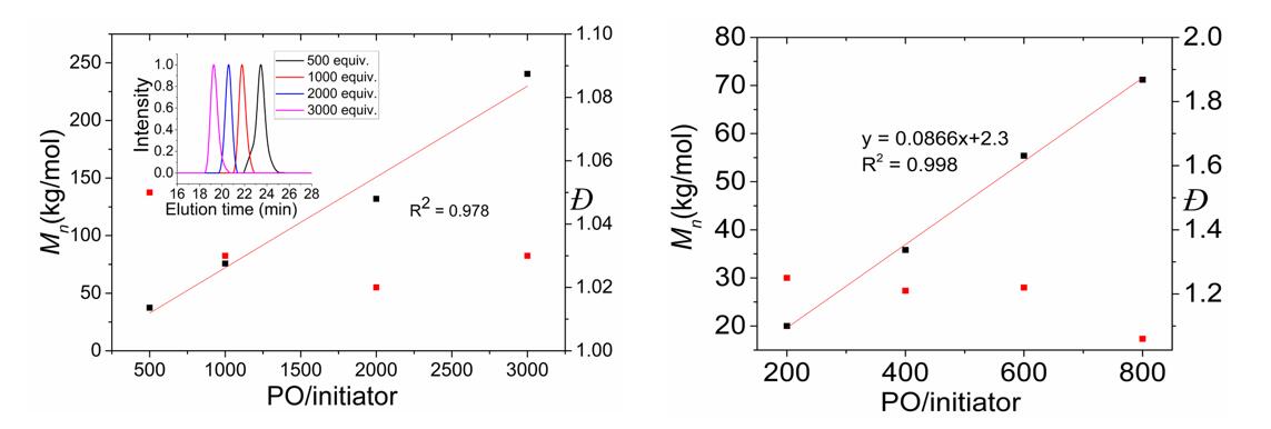 图2a,聚合物分子量与聚合度的关系图;2b,PO链增长实验