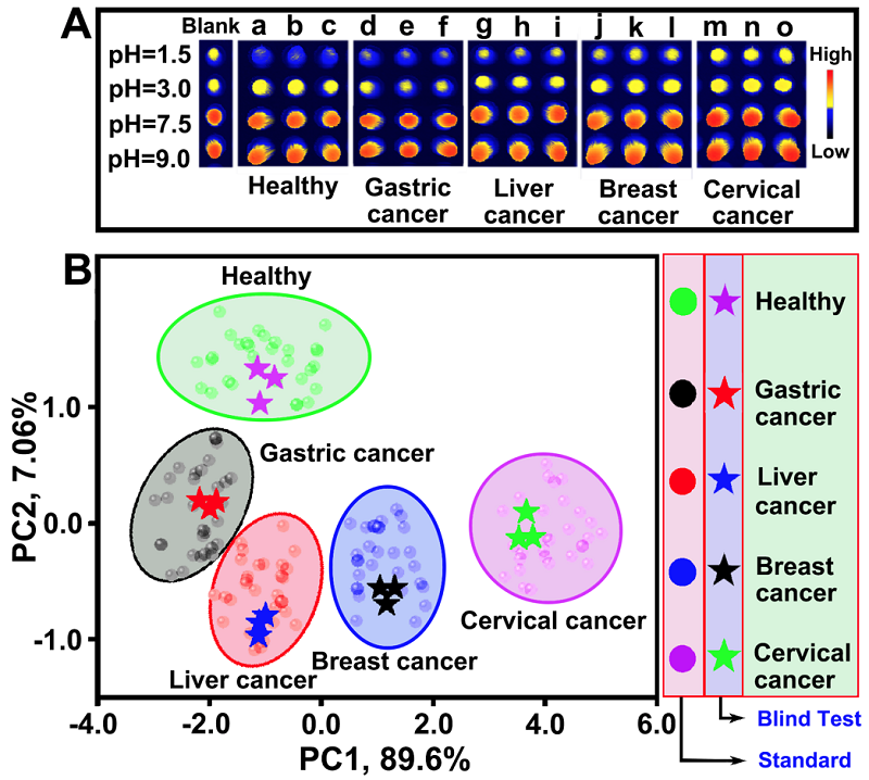 为了解决这一问题,我校本科三年级丁稼祥同学自大二暑假开始进入化学与分子工程学院徐升豪、罗细亮教授课题组进行科研攻关,开发了一种pH值编程的荧光传感阵列(图1),实现了健康人与胃癌、肝癌、乳腺癌以及直肠癌病人血浆的直接鉴定区分(图2)。同时,15例未知癌症血浆样本也被准确地被鉴定区分,该工作为癌症等重大疾病的早期筛查提供了快速、简便且有效的新方法。