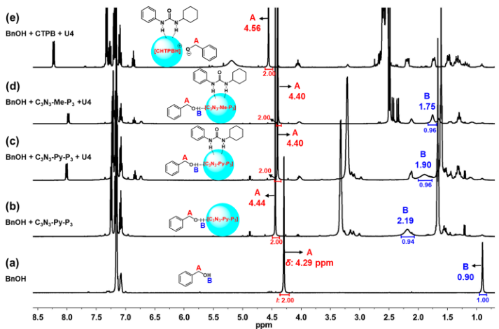 图3.原位核磁研究有机磷腈/脲/引发剂间相互作用机制