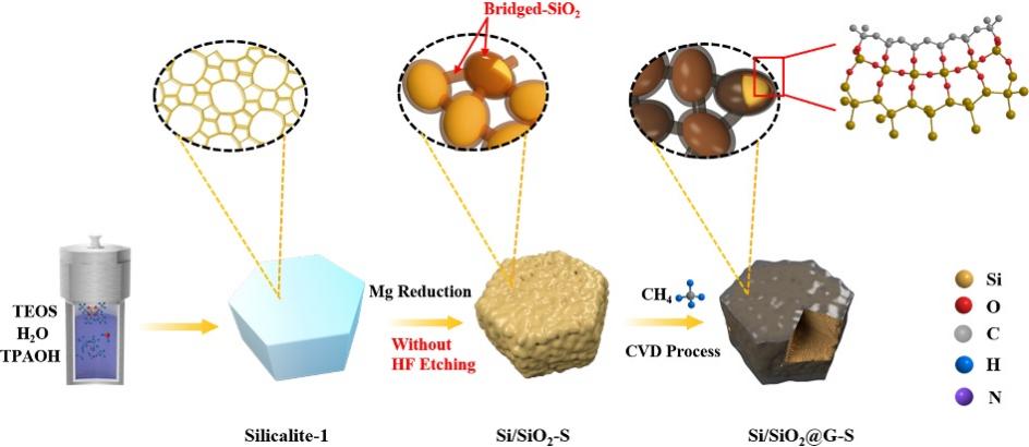 在该工作中,研究人员设计了一种自上而下的策略,利用镁热还原反应和化学气相沉积法构建了Si/SiO2@G-S超结构。Si/SiO2@G-S超结构成功合成取决于桥状SiO2包覆的Si纳米颗粒集成强大的三维网络。