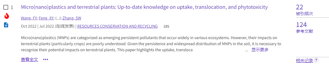 (1)论文1发表于环境类top期刊《Resources, Conservation & Recycling》(https://doi.org/10.1016/j.resconrec.2022.106503),累计被引22次。该文系统评述了微塑料在陆地植物中的吸收、转运和植物毒性,并探讨了当前研究的不足,指明未来需要优先研究的方向。