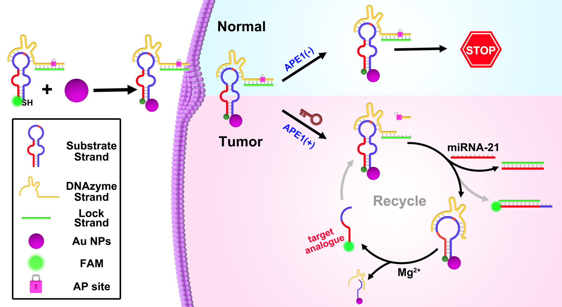 图1 内源性APE1激活的DNAzyme信号放大策略用于肿瘤细胞特异性分子成像示意图。图片来源:Anal. Chem.