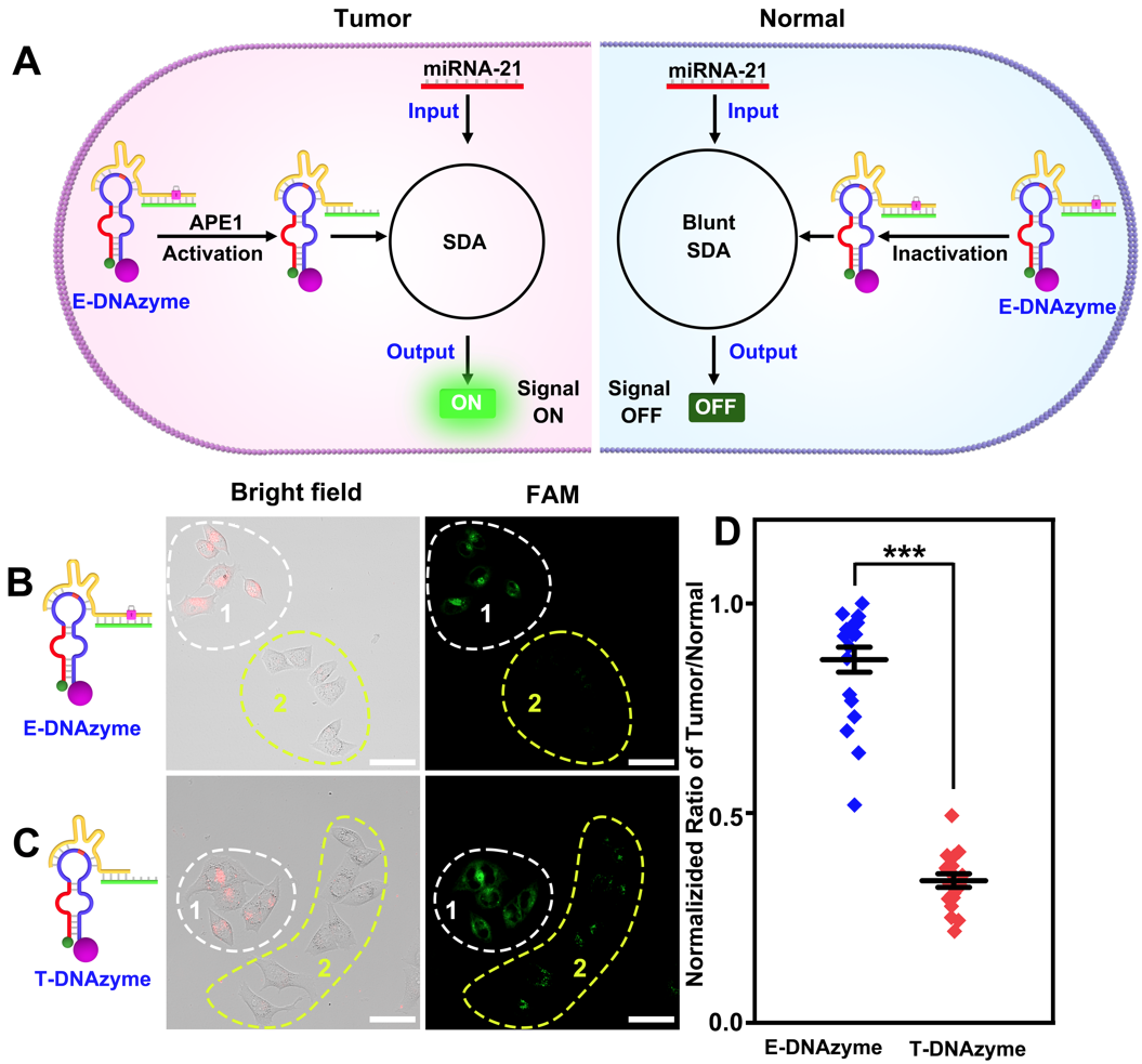 图2 内源性APE1激活的DNAzyme信号放大策略对混合培养细胞中肿瘤/正常细胞的辨别。图片来源:Anal. Chem.