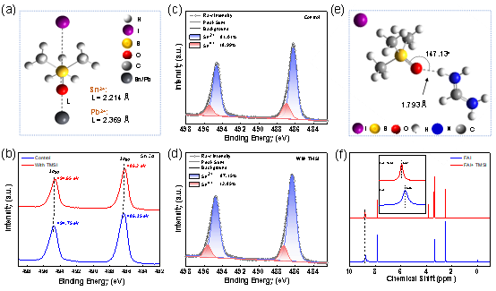 在钙钛矿中用锡取代部分铅,一方面可以降低毒性,另一方面可以降低带隙,潜在的改善器件性能。然而,锡铅钙钛矿结晶速度快、Sn2+易被氧化成Sn4+,使得锡铅合金钙钛矿薄膜的体相和表面产生很多缺陷,从而导致钙钛矿太阳能电池器件的不稳定性问题。鉴于此,周忠敏团队和合作者将含有亚砜基团的有机小分子三甲基碘化亚砜(TMSI)作为添加剂和氟化亚锡(SnF2)同时引入锡铅合金钙钛矿前驱体溶液中,以调节钙钛矿薄膜的结晶,制备高质量的钙钛矿薄膜。我们通过密度泛函理论(DFT)和核磁共振氢谱(1H NMR)分析了TMSI与钙钛矿的相互作用,并且通过XPS表明TMSI的引入抑制了Sn2+的氧化。
