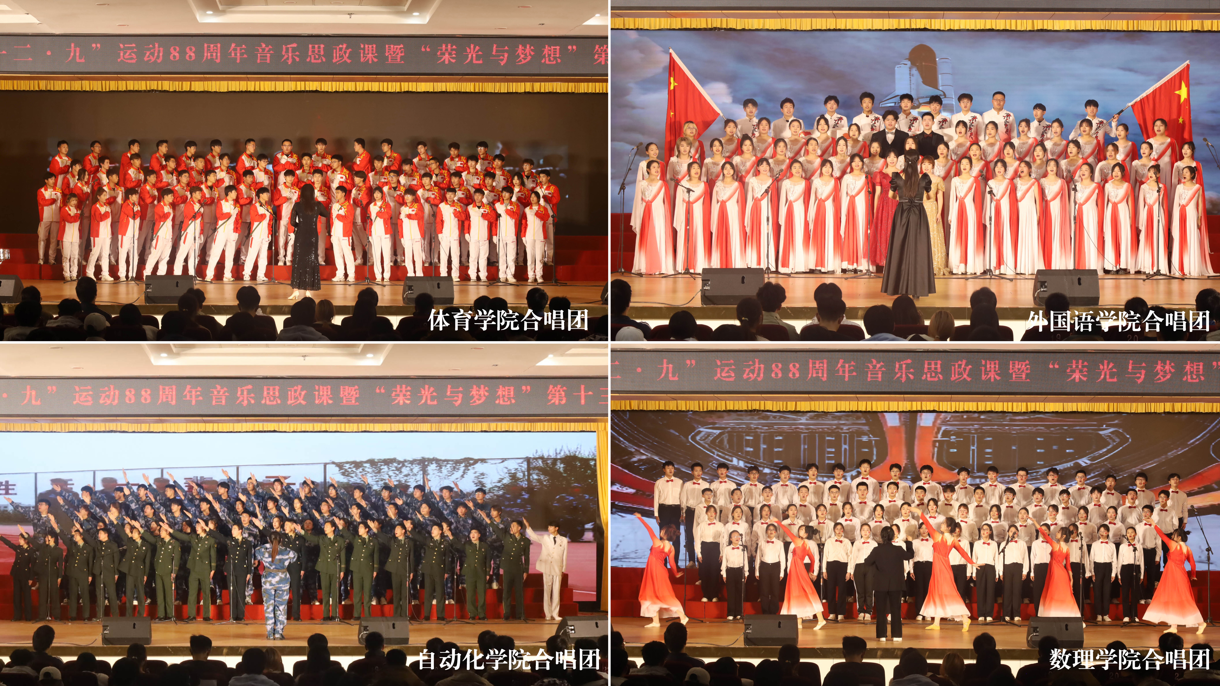本次音乐思政课暨大学生合唱比赛,以“荣光与梦想”为主题,共分为“峥嵘一二九·歌咏爱国情”“眷眷赤子心·砥砺再前行”“既往承壮志·奋进启新程”三个章节,围绕“回顾峥嵘岁月、展望美好未来、追梦崭新时代”的主基调,生动诠释了青年学生“请党放心、强国有我”的青春旋律、倾情唱响了“清澈的爱、只为中国”的时代强音,为全校青年学生带来了一场“声”入人心、触动灵魂的思政大课。